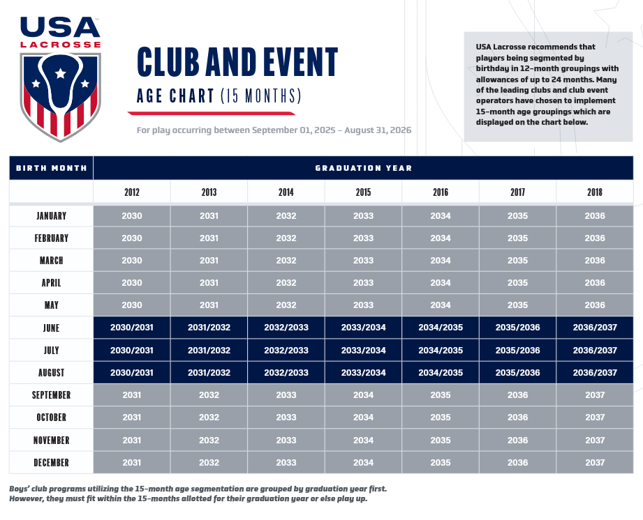The NLF has partnered with USA Lacrosse, to provide age guidelines for premier boys lacrosse clubs like ours to follow. These guidelines will help to insure a more level playing field in youth lacrosse, as they become widely adopted by clubs and tournaments.